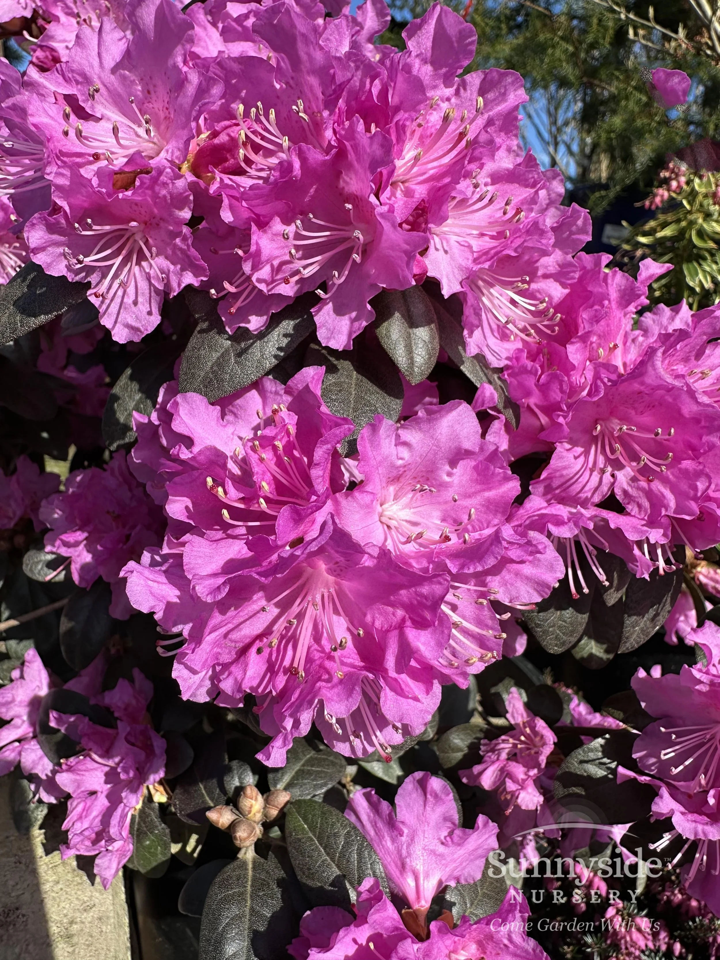 Ruffled violet purple flowers are openly funnel-shaped & held in compact, ball-shaped trusses of 11 flowers. Leaves are dark green, slightly glossy, reddish when young and bronzy in winter. Can tolerate full sun, blooms early to mid spring & reaches roughly 4-feet tall.