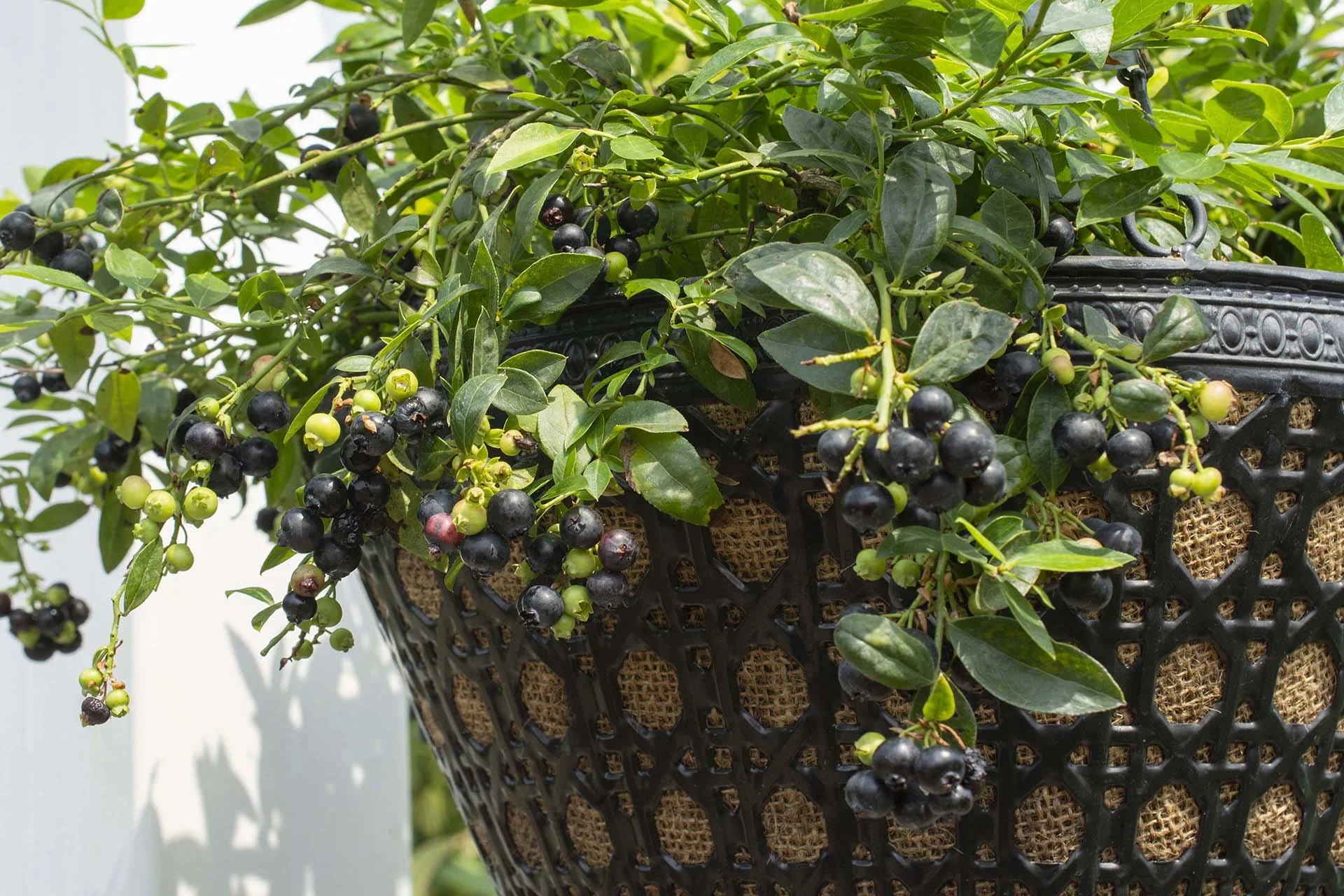 Hang this plant next to your colorful annuals for a beautiful & delicious combination. Clusters of classic & sweet tasting blueberries will cover the plants throughout the season, and the leaves will turn deep red & green in the winter months. Ripens mid to late season & reaches roughly 2 feet tall.