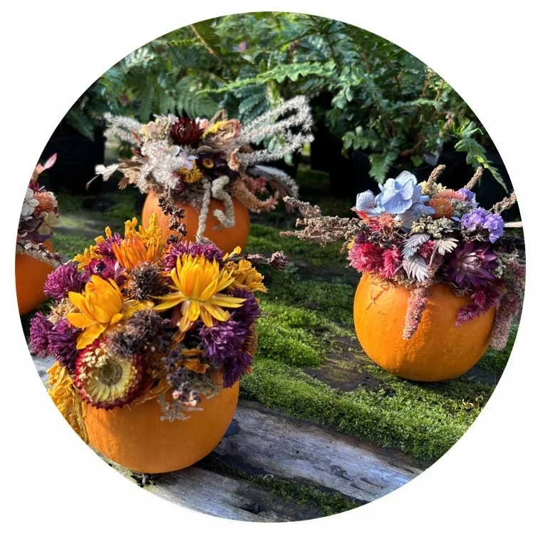 Fall vibes are in full force and it’s time to embrace them. Level up your fall decor this year with beautiful dried-plant and pumpkin combos! These handmade cuties are perfect as a centerpiece, decor item or a thoughtful gift… AND the plant material was grown and dried right here in the nursery, making them even more special! Join our very own Alysha (plant & DIY enthusiast) for this fun and cozy fall workshop. Perfect for all ages; make it a family project, bring a friend or fly solo and surprise everyone (maybe even yourself too) with your creative maker talents!