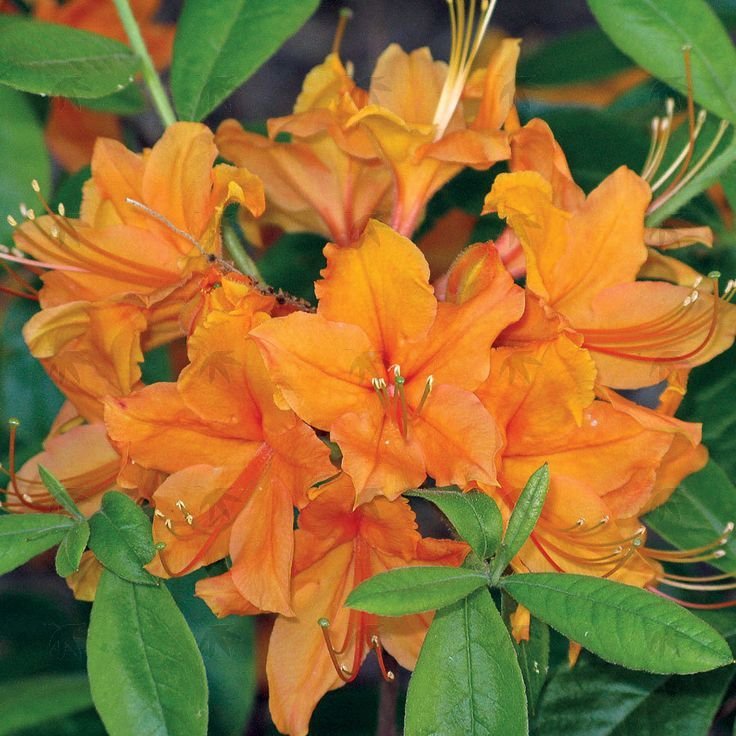 Bright orange with yellow flowers are widely funnel-shaped & held in ball-shaped trusses of about 10 to 15 flowers. Leaves are elliptic with slight wrinkles above & slightly hairy below. Has a compact habit. Can tolerate full sun, blooms mid spring & reaches roughly 4-feet tall by 5-feet wide
