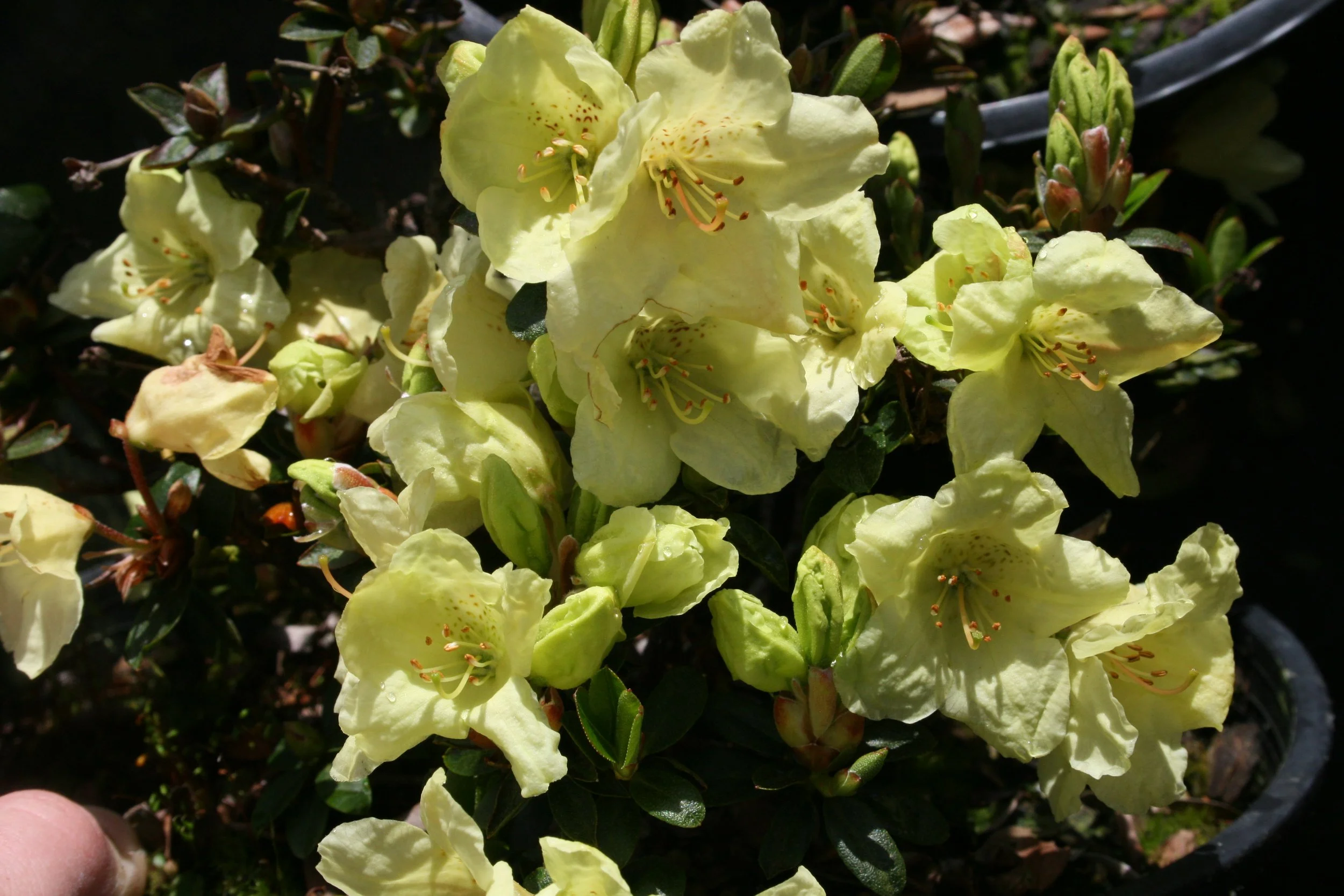 Considered the best yellow-flowering rhody so far. The flowers are banana or gold-yellow with burgundy red dots. Grows slowly & is very compact, flowering reliably & abundantly every year. It likes full sun and needs a sheltered location. Blooms mid spring & reaches roughly 3-feet tall.