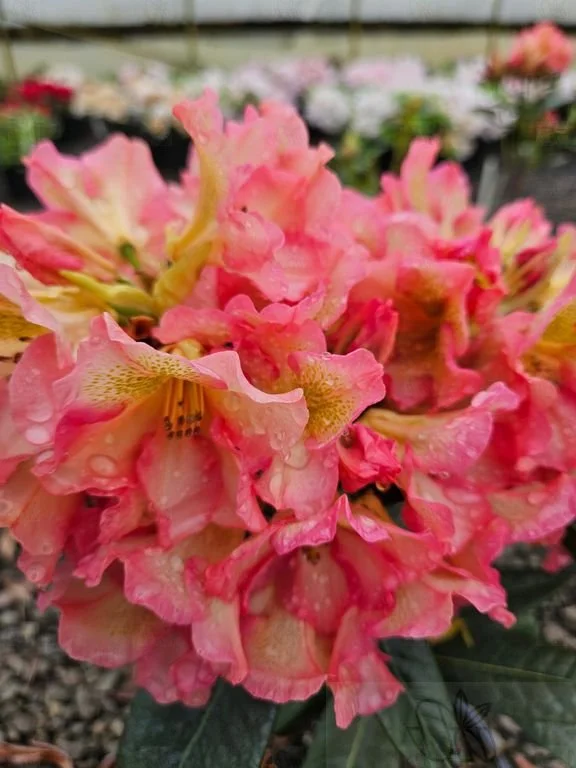 Creamy yellow with pink flowers are funnel-shaped & held on ball-shaped trusses with about 13 to 15 flowers. Leaves are a glossy, medium green & plant is a compact & well-branched shrub. Blooms mid spring & reaches roughly 3-feet tall.