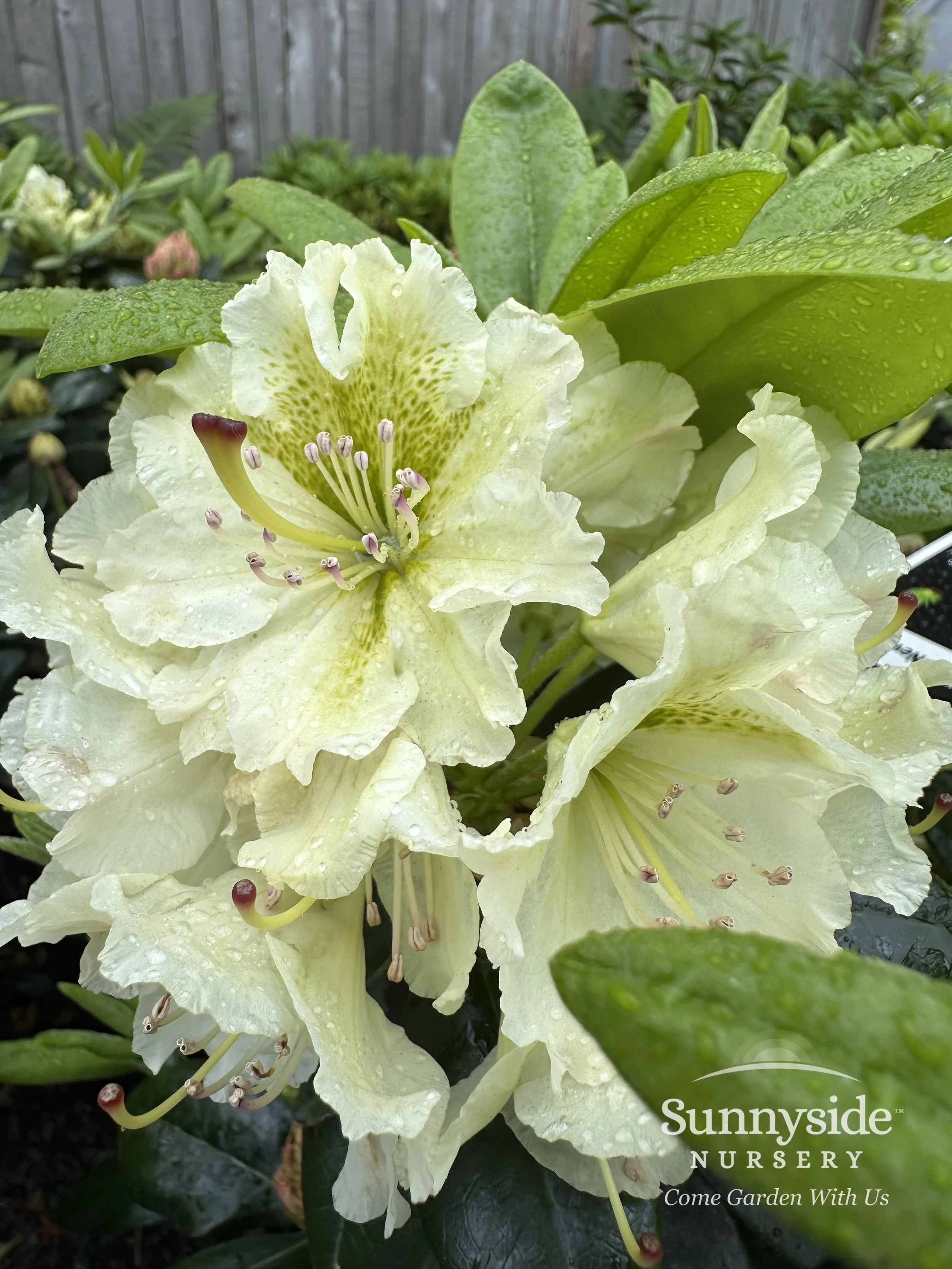 Flowers are broadly funnel-shaped, wavy- to frilly-edged, a creamy yellow color & held on ball-shaped trusses of 5 to 18 flowers. Leaves have down-curved margins, are glossy & a mid green color. Leaves held 2+ years. Has a dense plant habit, blooms mid spring & reaches roughly 3-feet tall.