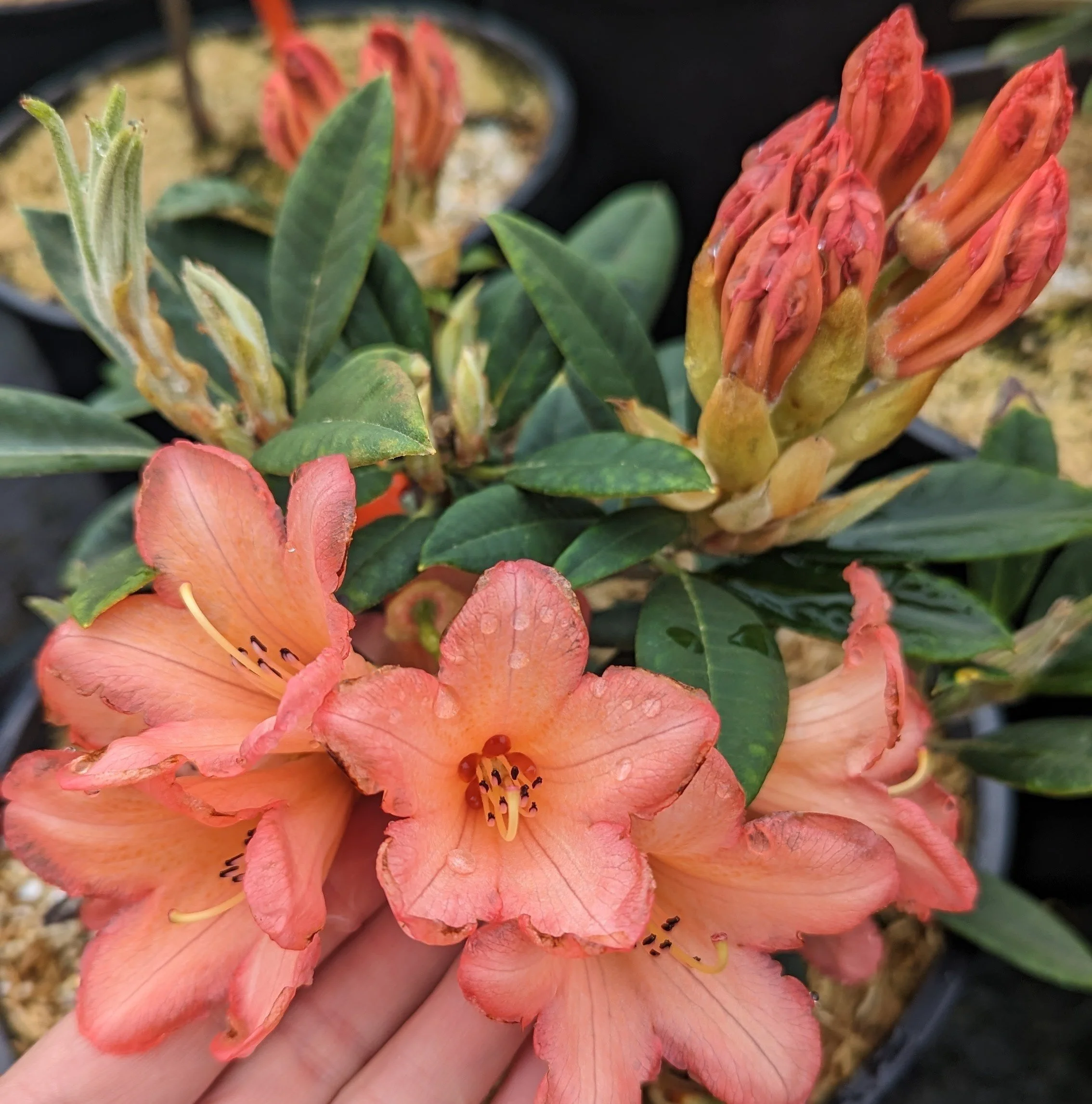 Flowers are funnel-shaped, a bright tangerine color with touches of pink & held on loose trusses of up to 8 flowers. Foliage is dark green with light fawn indumentum & plant has a mounding growth habit. Blooms mid spring & reaches roughly 3-feet tall.