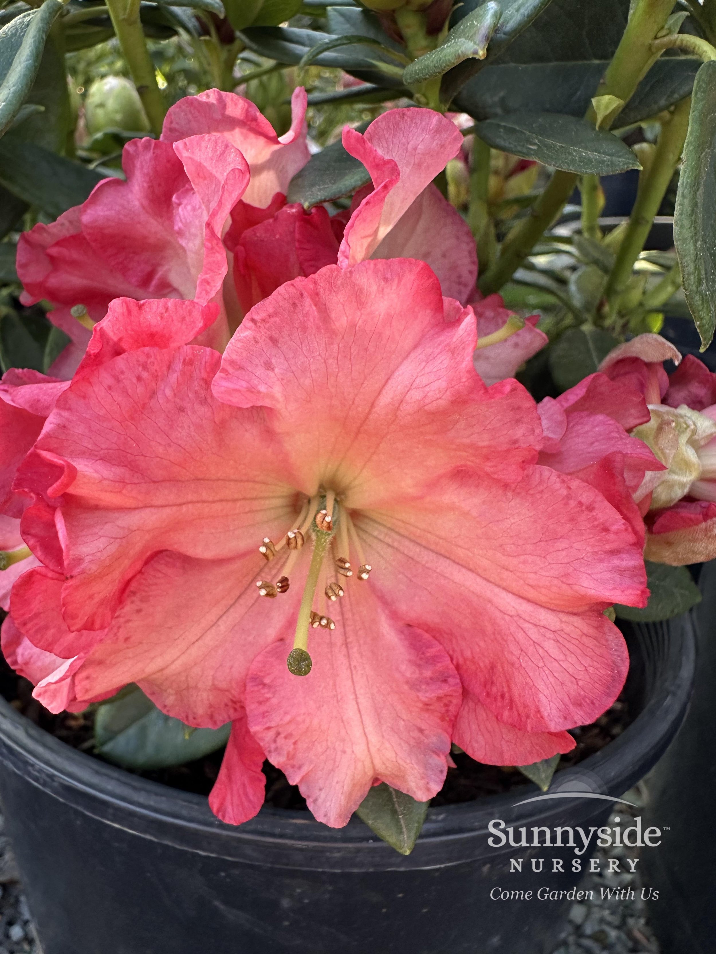 Flowers are openly funnel-shaped with wavy edges, vivid yellowish pink coloring with deeper edges, vivid red throat & reverse reddish orange rays. Held in trusses of 10 to 14 blooms. Blooms mid to late spring & reaches roughly 4-feet tall.