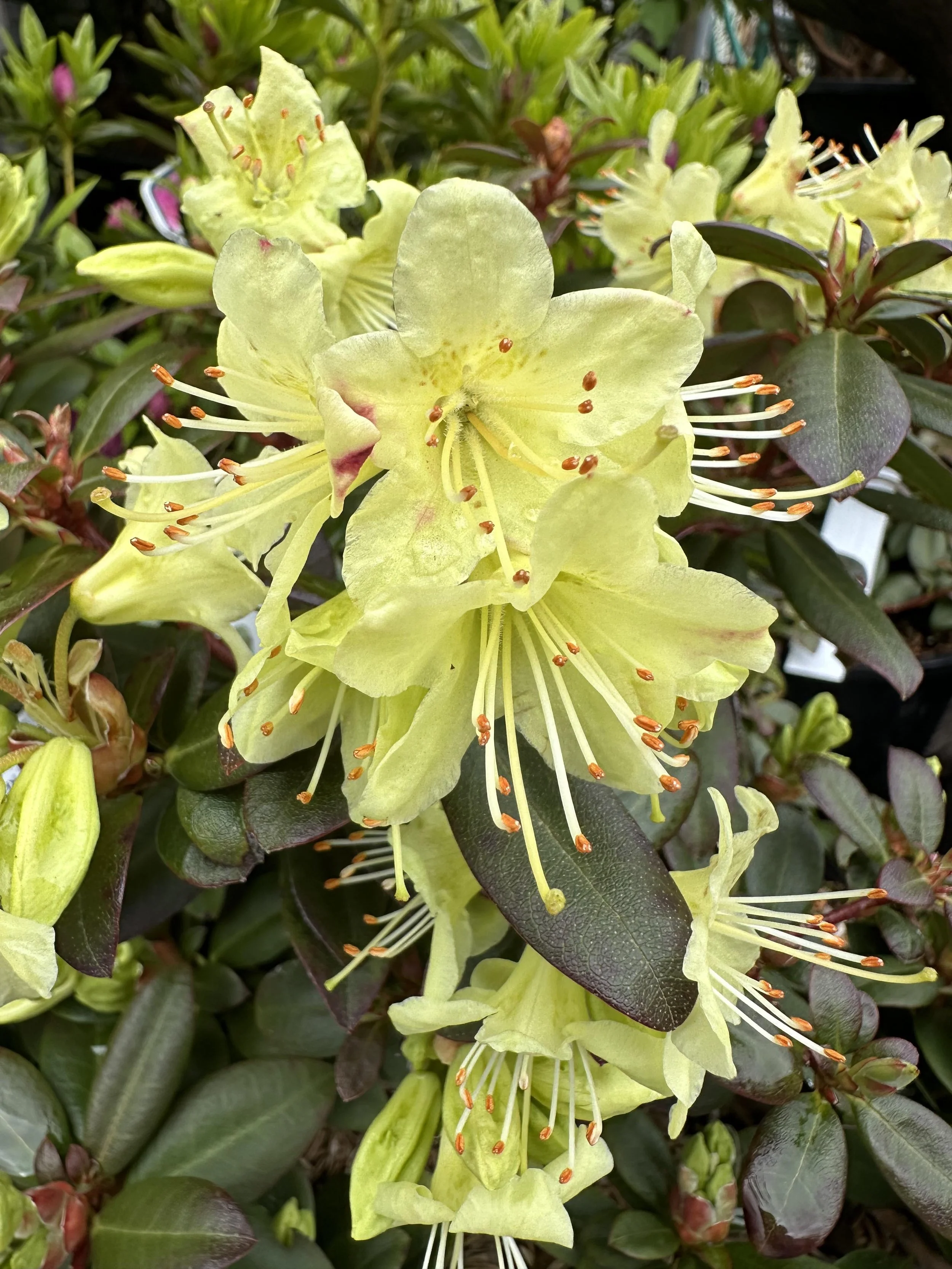 Flowers are funnel-shaped, a creamy yellow with pink color & held on dome-shaped trusses of about 14 flowers. Leaves are thick, deep green & plant has a dense, rounded, very attractive habit. Can tolerate full sun, blooms early to mid spring & reaches roughly 4-feet tall.