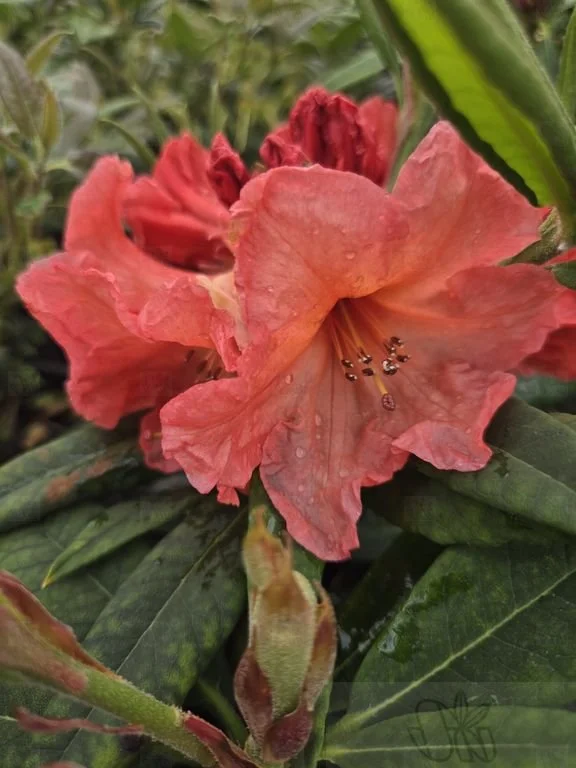 Orangey-pink flowers are funnel-shaped & held on attractive trusses. Leaves are a rich green color that pair well with flowers. Blooms late spring & reaches roughly 3-feet tall.