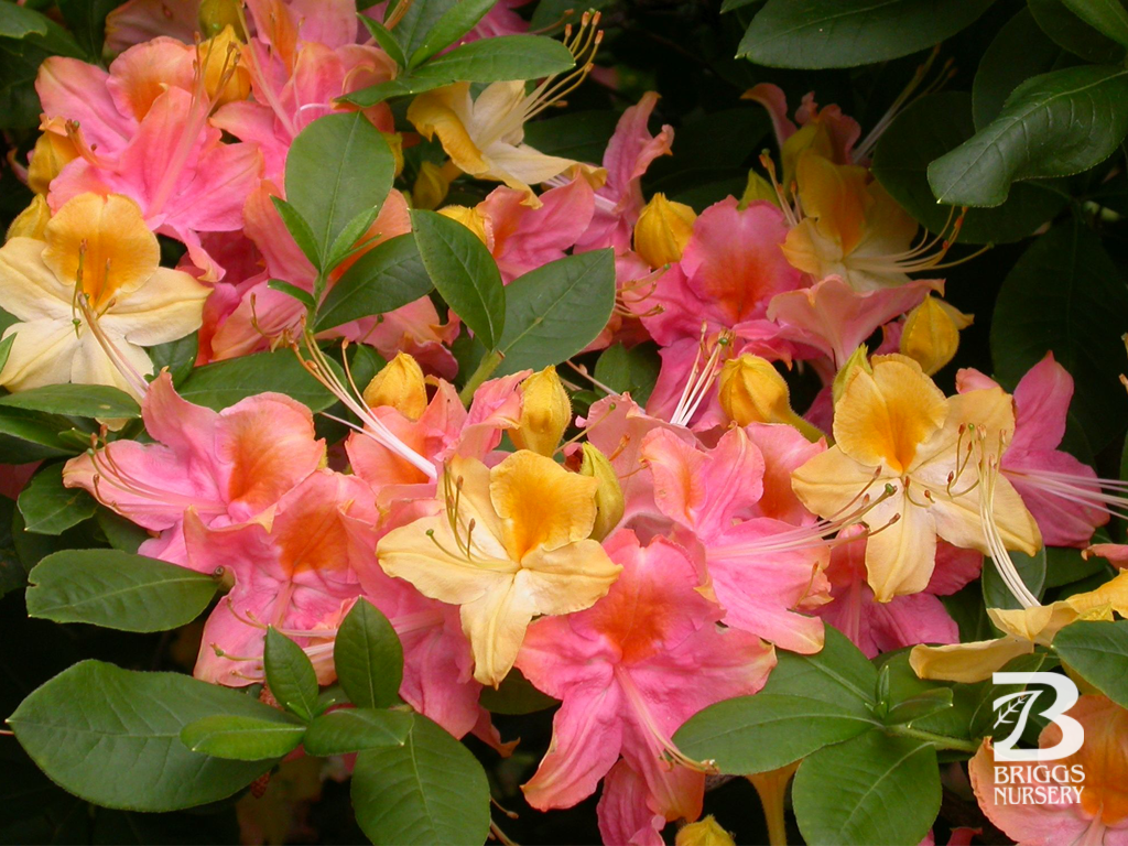 Fragrant salmon-pink flowers are widely funnel-shaped with wavy lobes & a vivid reddish-orange blotch. Blooms are held on ball-shaped trusses of about 11 flowers. Leaves are long with a moderate yellowish-green color & plant has an upright habit. Can tolerate full sun, blooms late spring & reaches roughly 5-feet tall by 5-feet wide in size.