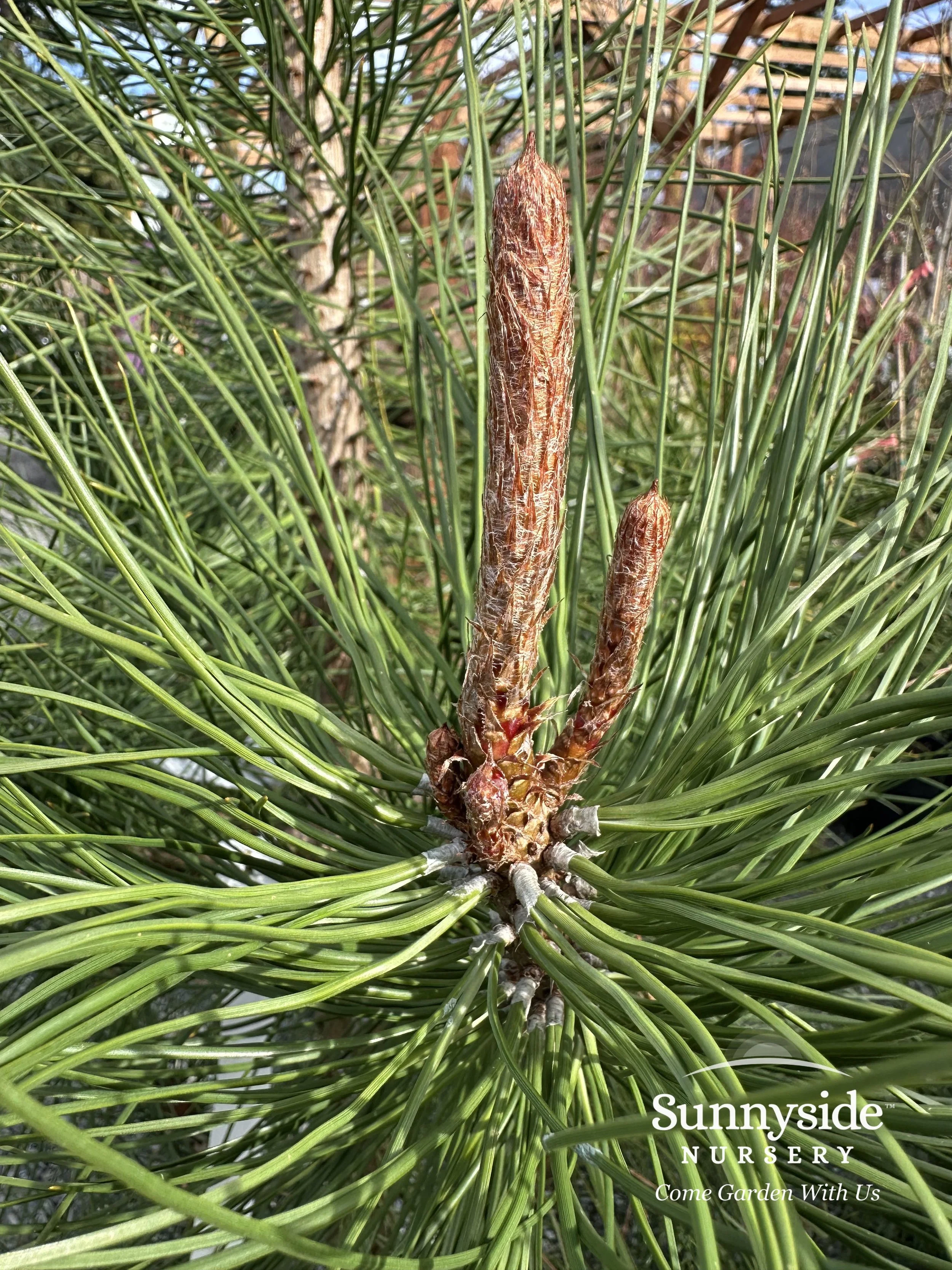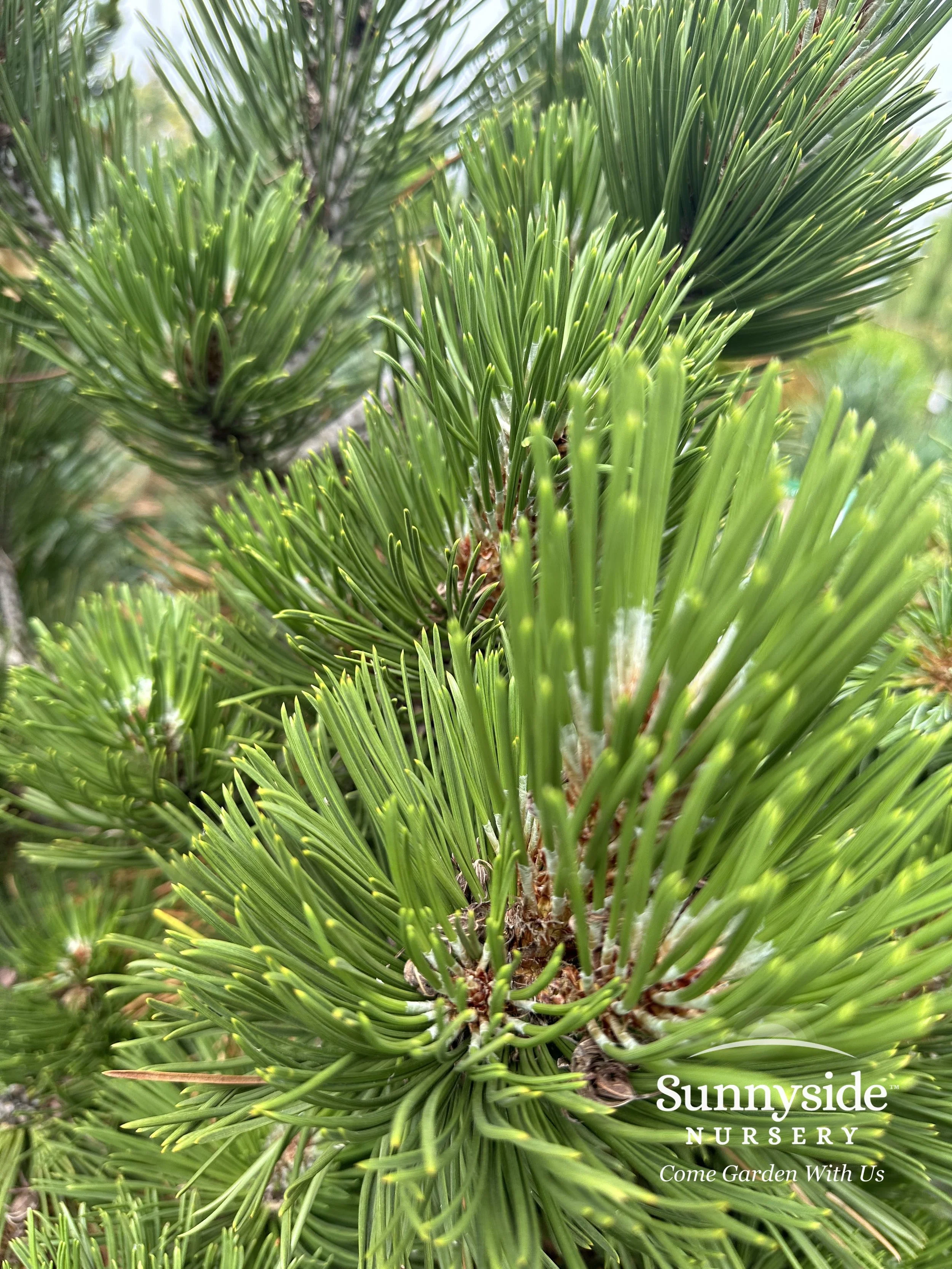 Upright branches on the tall, trim tree display pairs of elegant, dark green needles accented by silvery white fascicles & bark. Has the impression of being a big tree, yet it stays decidedly narrow. Whether used as an individual focal point, paired to mark the entrance to house or garden, or grouped in an informal cluster, this beautiful garden pine scores a bull's eye on the designer's dartboard. Has a broad upright growth habit & reaches roughly 15’ tall by 8’ wide in size, growing 6” to 12” a year.