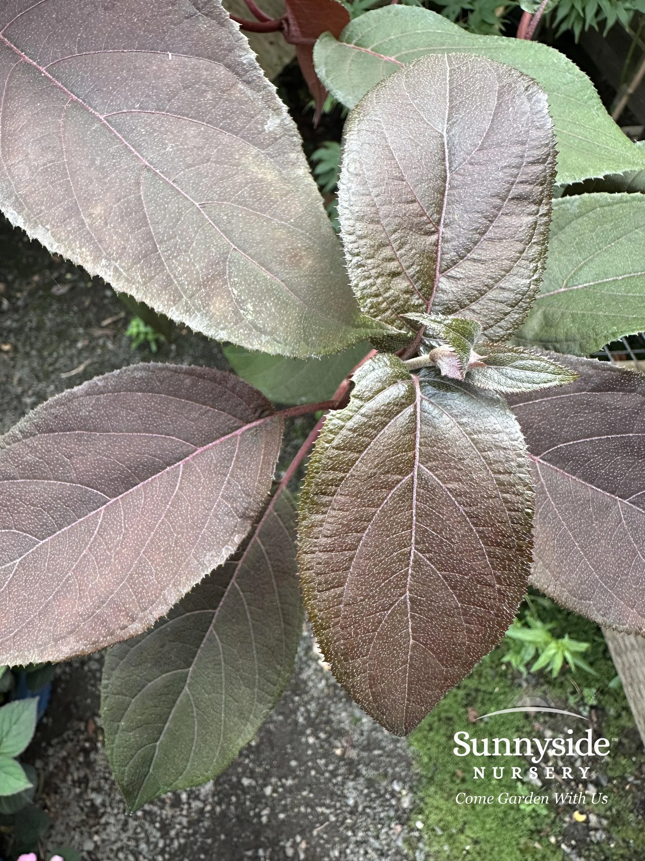 The first ever purple leaved Hydrangea. A unique shrub with greenish-purple new foliage, the leaves aging to deep purple with rosy purple undersides. Wispy flowers nicely contrast with the dramatic, colorful foliage. Excellent fall color. Needs full to partial shade & reaches roughly 5 to 6 feet tall by 5 to 6 feet wide in size.