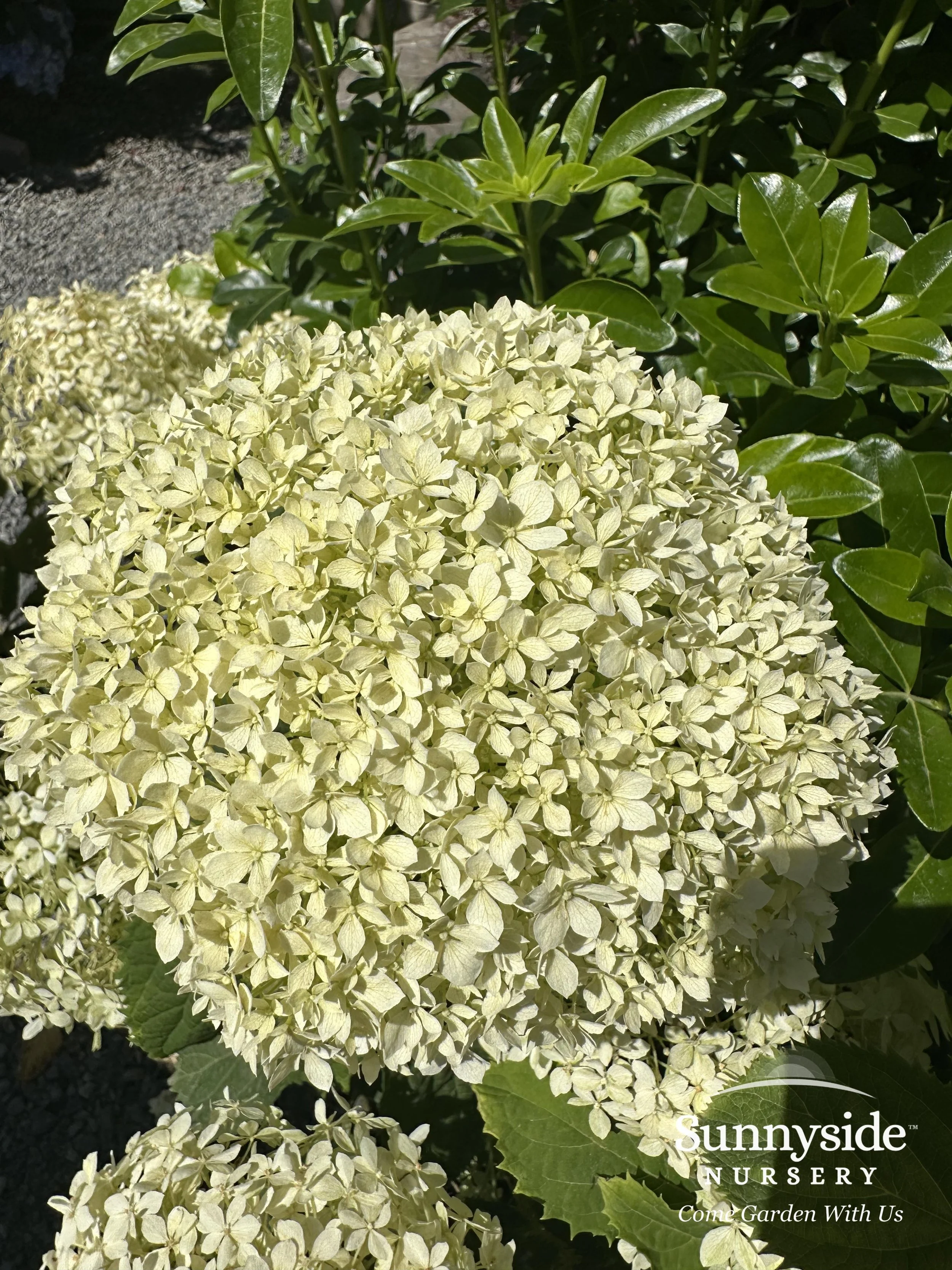 Produces huge, full flower heads, as large as 12" across & is both reliable and beautiful. Flowers open green, then mature to white before fading to green again. Very sturdy stems hold the blooms upright even if soaked with rain. This very cold hardy shrub blooms on new growth, so even very cold winters won't keep it from blooming. Needs partial to full sun & reaches roughly 4 to 5 feet tall by 4 feet wide.