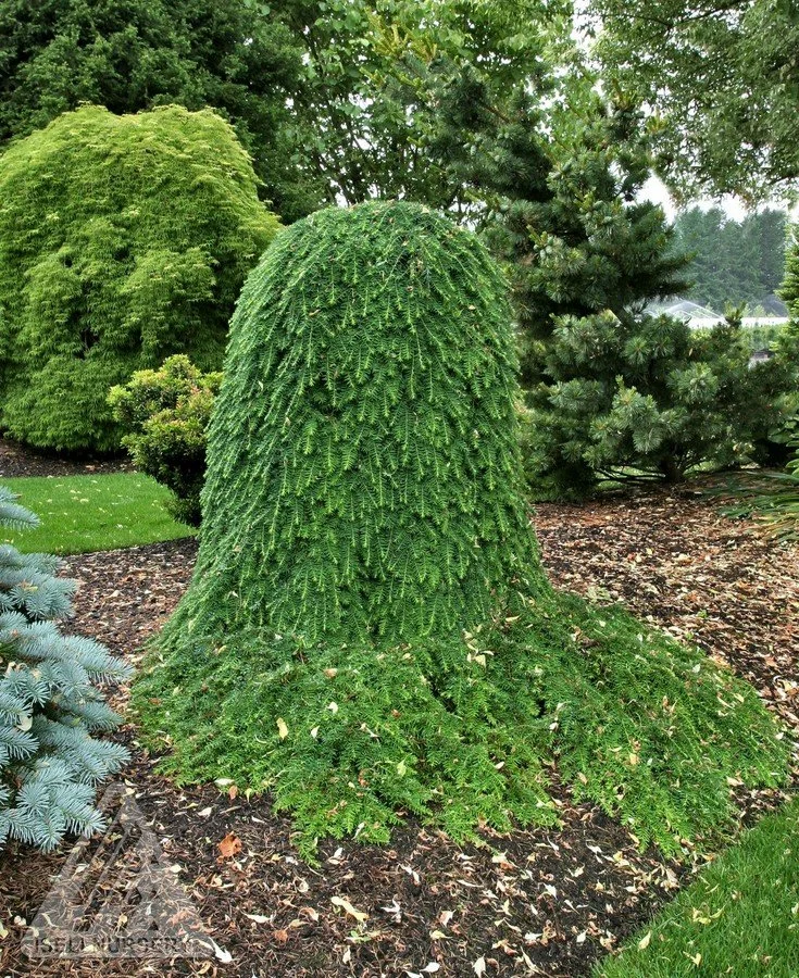 A most graceful dense mounding shrub with broadly spreading branches that create a weeping effect with the deep green, finely textured foliage. An exceptional accent for large rock gardens or border plantings. Thrives in full sun to full shade. Has a weeping growth habit & size varies with culture, growing 12” to 15” a year.